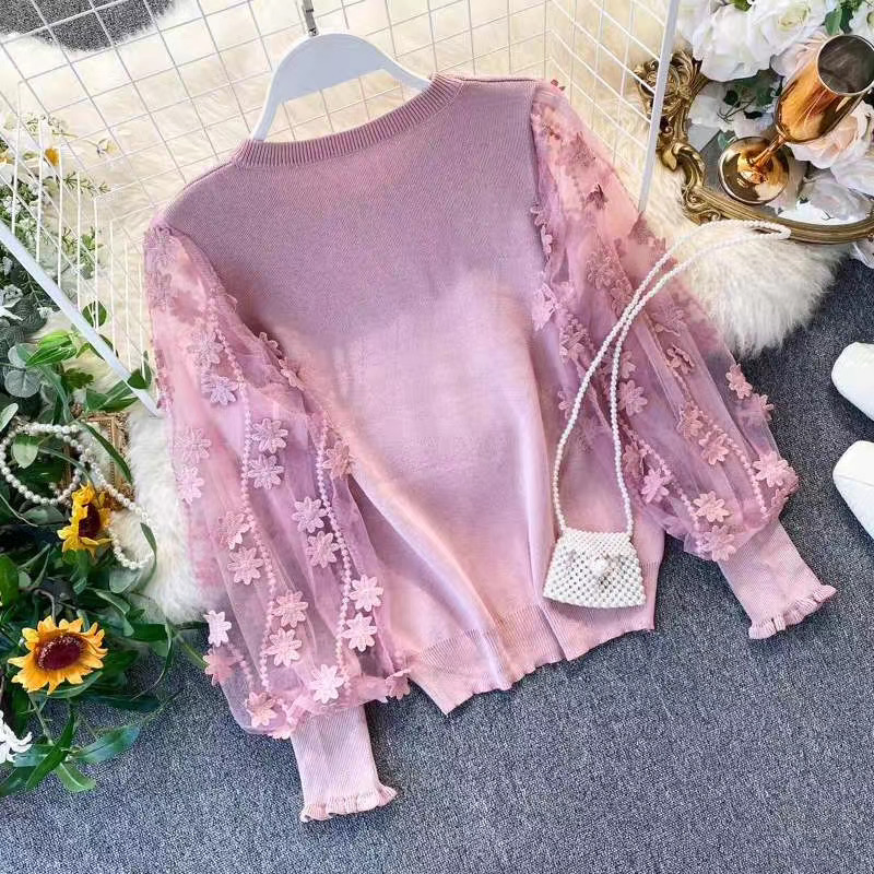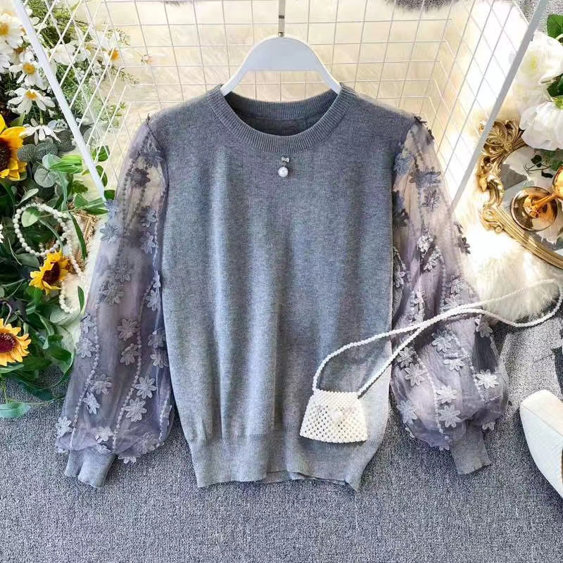 Suéter de Manga Larga de Encaje de Retazos de Cuello Redondo de Nueva Moda 2020 para Mujer
