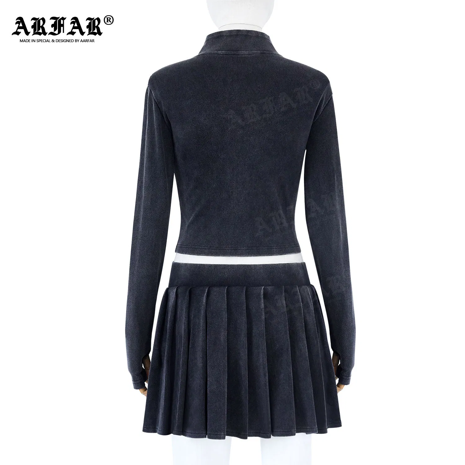 Conjunto Personalizado de Mujer Falda Plisada Acanalada de Punto de Cuello Alto Chaqueta Corta con Cremallera Bordado Conjunto de Dos Piezas de Cintura Alta para Mujer