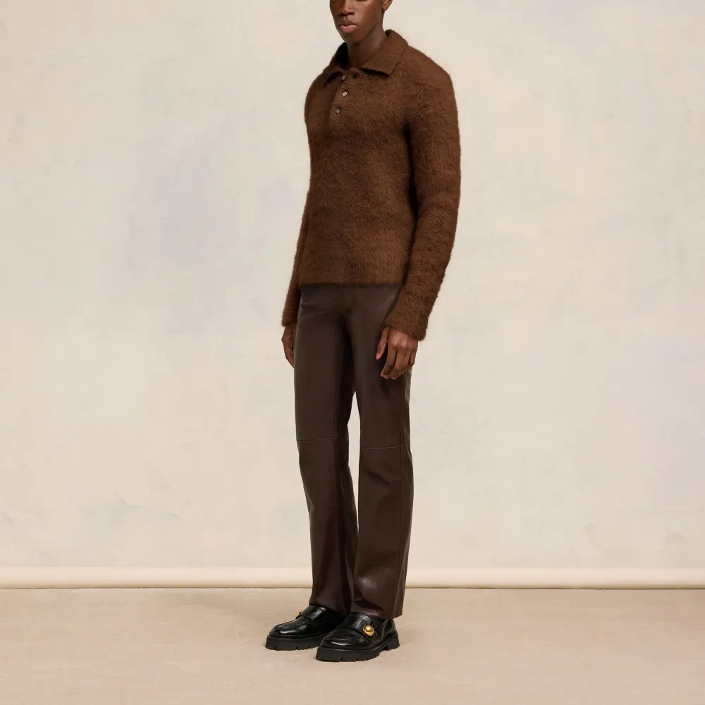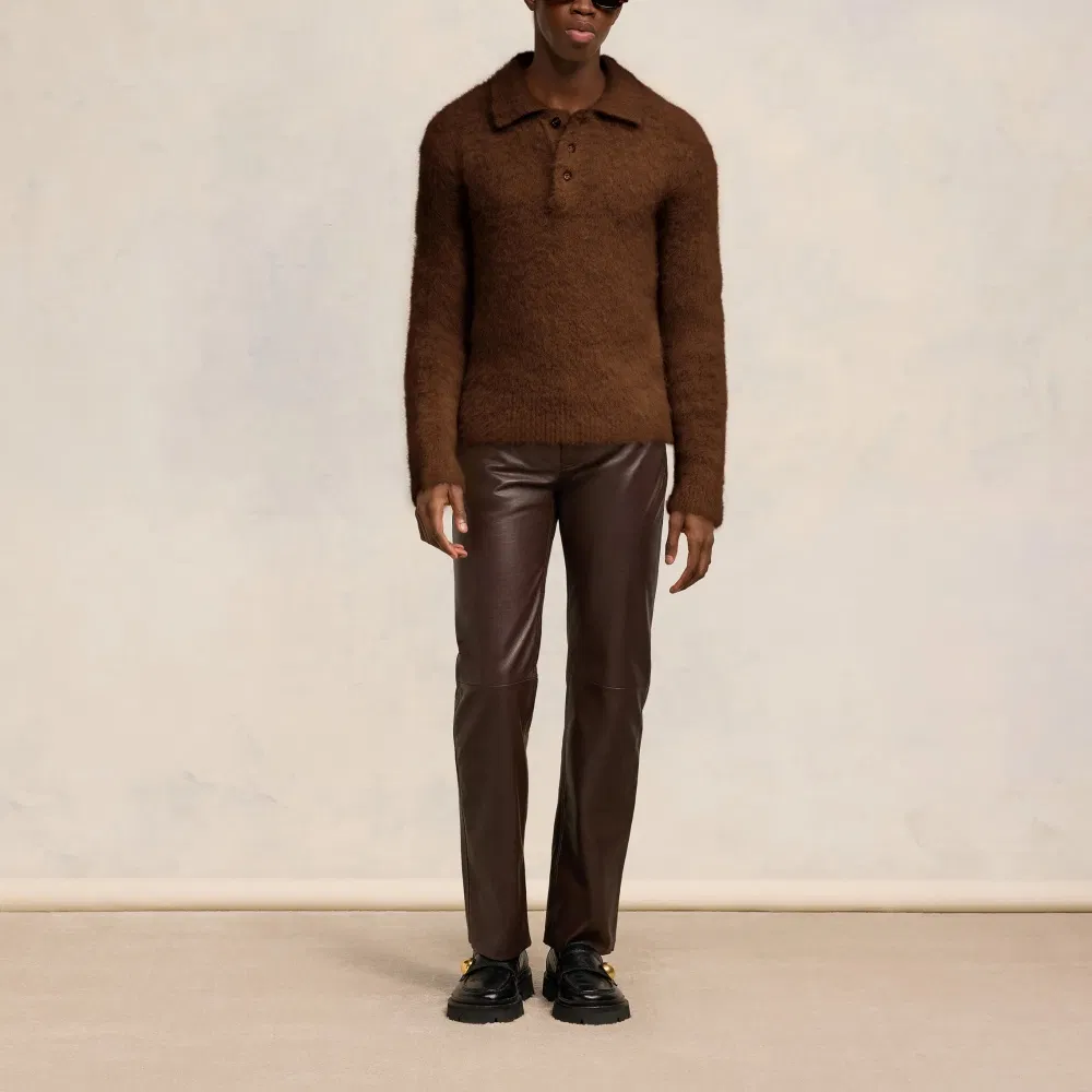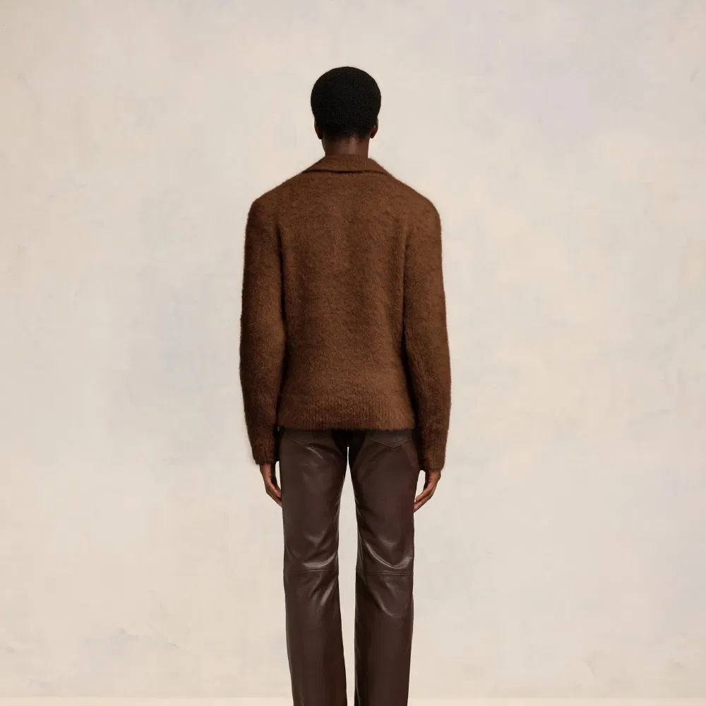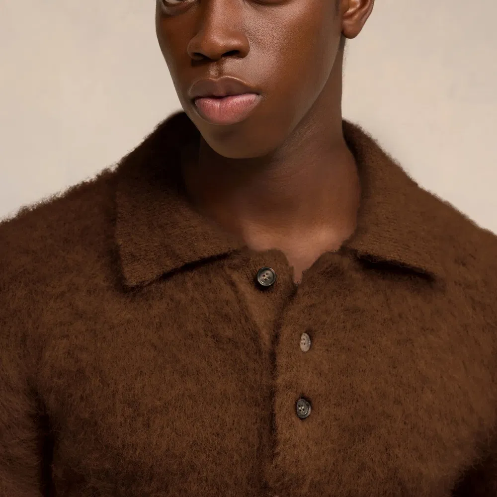 Lujoso Suéter Polo de Mohair Marrón para Hombre-Estilo Acogedor
