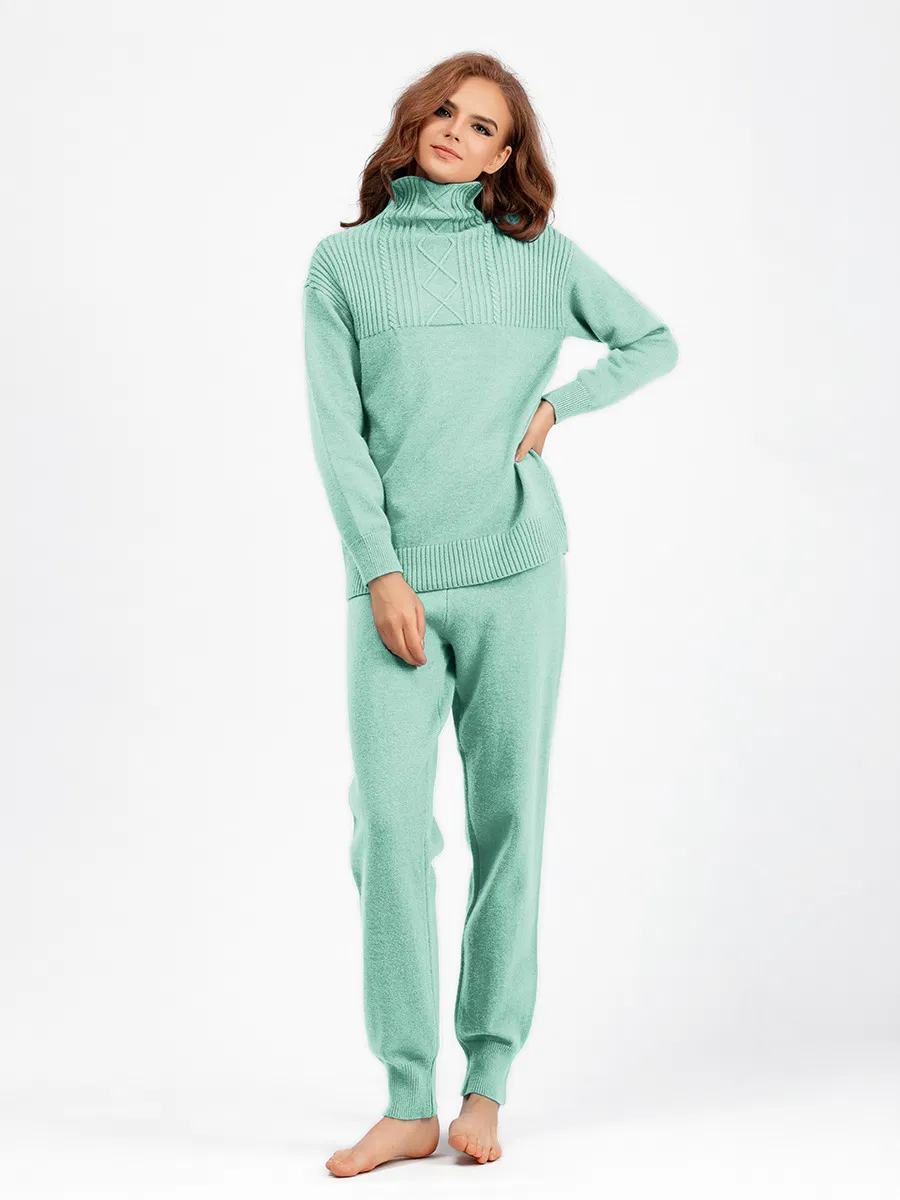 Casual Suelto Otoño Invierno Pantalones de Punto Suave Traje de Mujer de Cuello Alto Cálido Acogedor Conjunto de Suéter Clásico